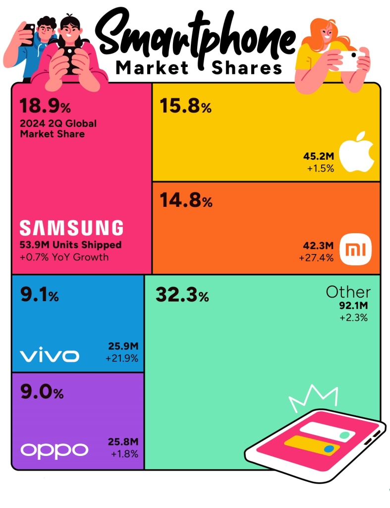 در رتبه سوم، شیائومی چین قرار دارد که 14.8٪ از بازار جهانی گوشی‌های هوشمند را به خود اختصاص داده است. در دهه گذشته، این شرکت سهم بازار جهانی خود را بیش از سه برابر کرده است. پس از آن، دو غول دیگر چینی، ویوو و اوپو، قرار دارند که هر کدام بیش از 25 میلیون واحد گوشی در سه‌ماهه دوم 2024 فروخته‌اند.